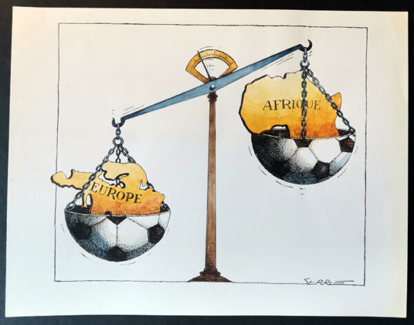 « FOOT FRANCE AFRIQUE » planche Originale 1990 Rare signée Claude Serre (taille 21 x 27 cm) publiée dans la presse paru aux éditions Glénat 1990 , et faisant partie d’une série de dessins sur le sport destiné à illustrer des articles de presse. Ce dessin est signé. Serre a été dessiné à l’aquarelle et à l’encre de Chine et à la plume. Ce dessin est une planche originale unique Taille (21x 27 cm) avis aux collectionneurs. dessin en parfait état et livré avec certificat d’authenticité.