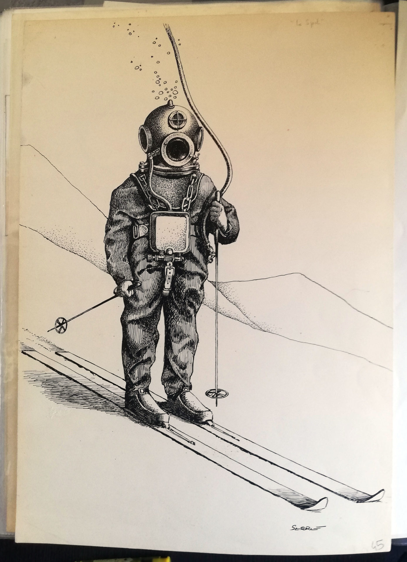 LOT 25 « SKIEUR DE FOND » planche originale de Claude SERRE publiée dans albums « LE SPORT » 1975 ed. Glénat – Rare signé (taille 30 x 42 cm) plume encre. Ce dessin est une planche originale unique faite de la main de Claude Serre. Elle compte parmi les dessins publiés les plus anciens de Claude Serre. Faisant parie du deuxième album, un des albums les plus vendu ( plus de 15 pays). Ce dessin représente un scaphandrier au fond de la mer et portant des skis . Ce dessin a été édité dans 2 albums de Claude SERRE » Le sport » 1975 aux éditons Glénat; et réédité , puis dans dans « sport » aux éditions Glénat Collection les intégrales de SERRE. . avis aux collectionneurs. CE DESSIN PRESENTE UNE TRANCE D’USURE EN BAS A GAUCHE